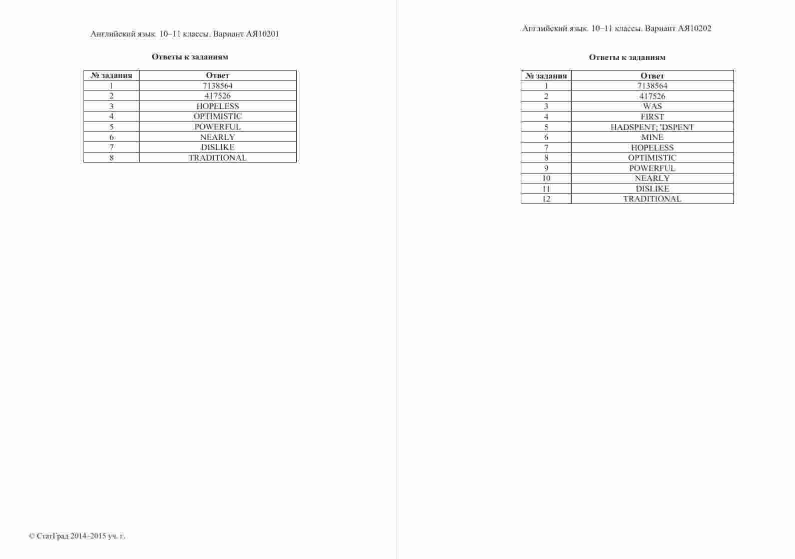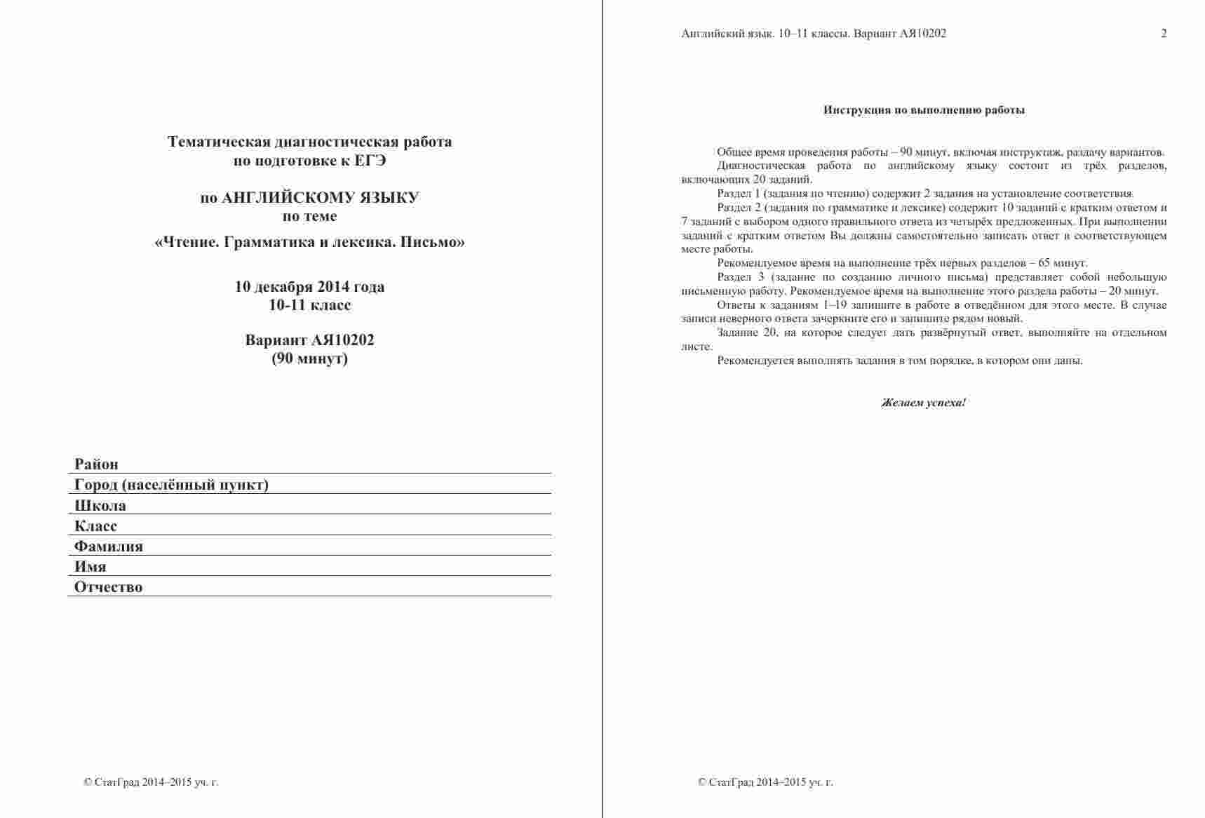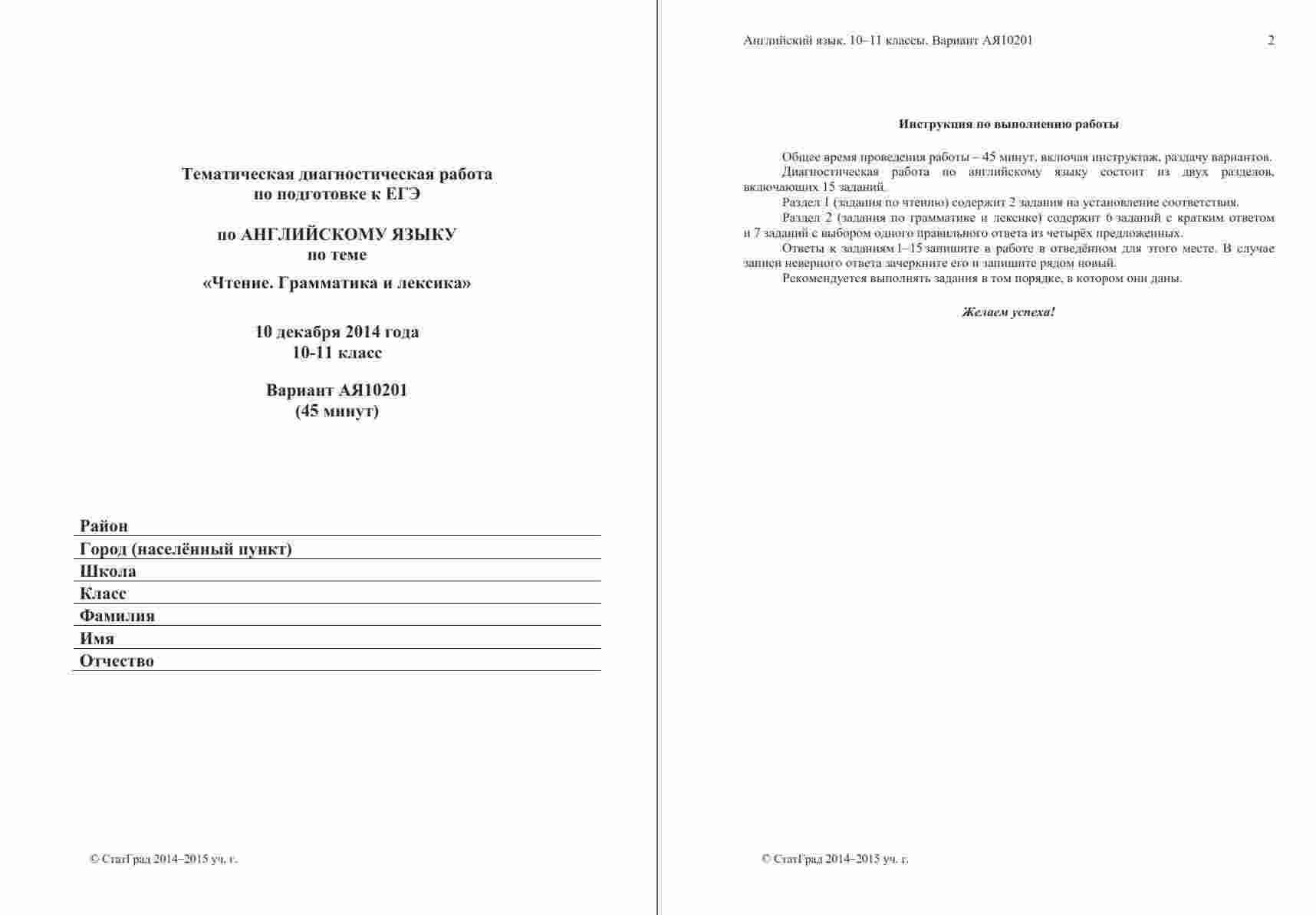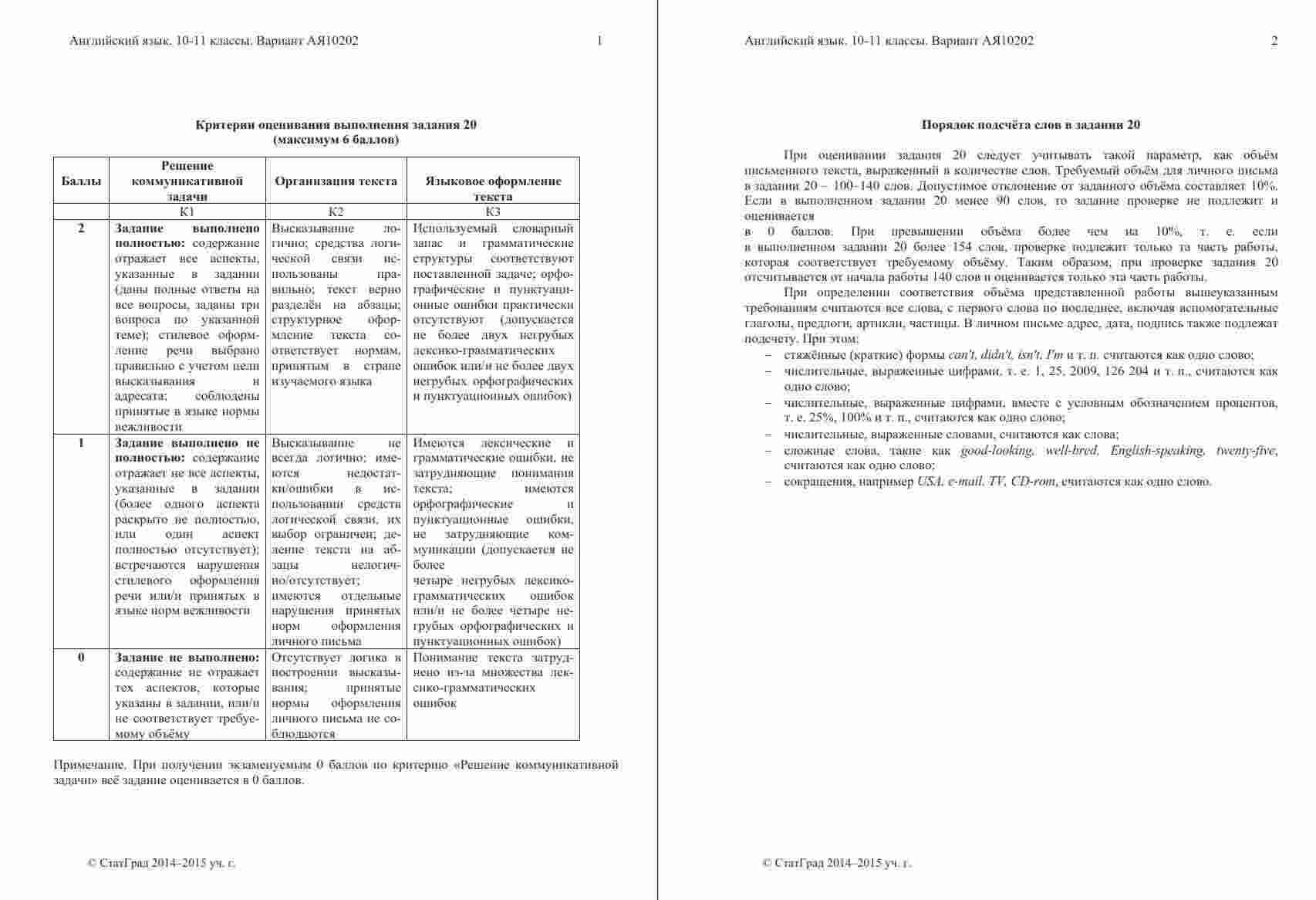 Книга "ЕГЭ Английский язык 11 класс. Чтение 10.12.2014. Ответы критерии вариант АЯ10201-2" представляет собой официальные ответы и критерии оценивания к варианту чтения на ЕГЭ по английскому языку в 11 классе. Эта книга поможет ученикам проверить свои ответы и узнать, как они оцениваются на экзамене. Книга включает в себя тексты заданий по чтению, а также подробные ответы и критерии оценивания, что позволяет ученикам сравнить свои ответы с правильными и понять, как они будут оцениваться экзаменаторами. Эта книга будет полезной как для учеников, готовящихся к ЕГЭ по английскому языку, так и для их учителей, чтобы предоставить дополнительные материалы для анализа и обсуждения результатов чтения на экзамене.