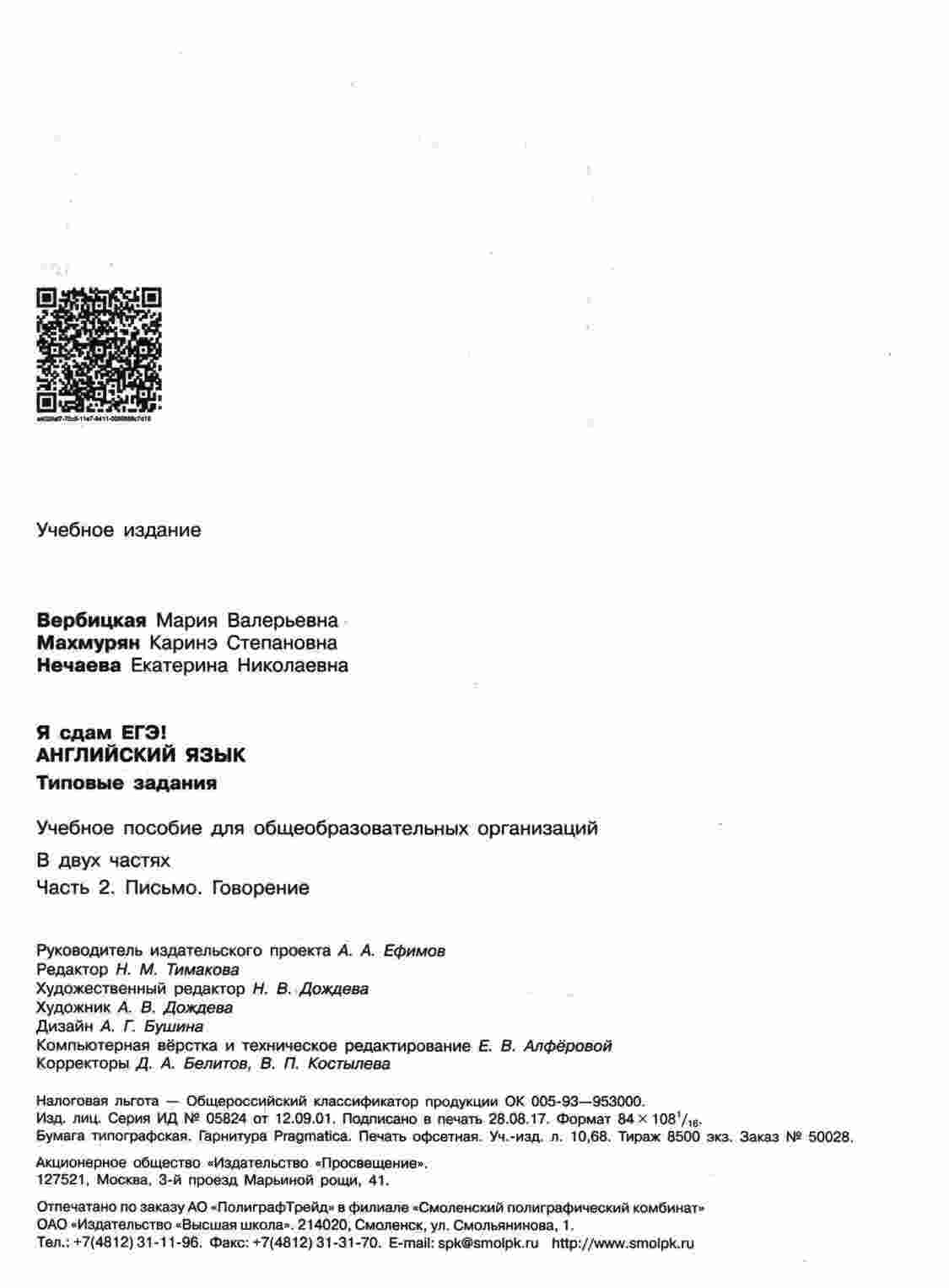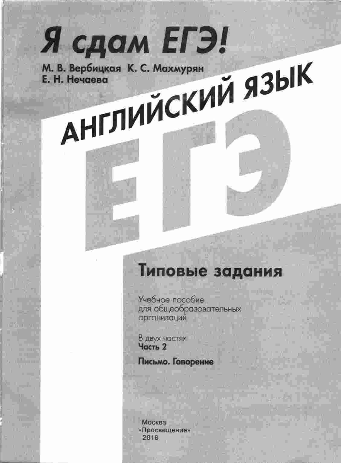 "ЕГЭ 2018 Английский язык Типовые задания Письмо говорение Вербицкая Махмурян часть 2" - это вторая часть учебника, предназначенного для подготовки к ЕГЭ по английскому языку. В этой части вы найдете типовые задания по письму и говорению, которые помогут вам развить навыки коммуникации на английском языке. Авторы книги, Вербицкая и Махмурян, разработали упражнения, которые позволят вам научиться писать эссе, составлять письма, и выступать на английском языке. Каждое задание снабжено образцами выполнения и рекомендациями, что помогает вам развивать навыки и уверенно сдавать экзамен. Эта книга станет вашим надежным путеводителем в подготовке к ЕГЭ и поможет вам достичь высоких баллов на экзамене.