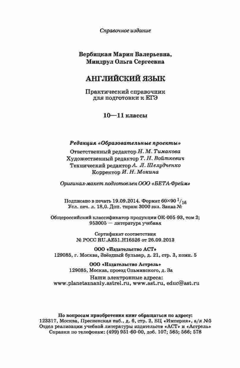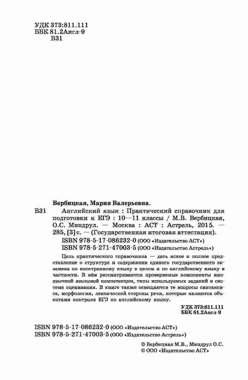 "Английский язык Практический справочник для подготовки к ЕГЭ 10-11 класс Вербицкая Миндрул" - это полезный ресурс для студентов старших классов, готовящихся к сдаче ЕГЭ по английскому языку. Книга разработана Вербицкой и Миндрул, опытными преподавателями английского языка, и представляет собой практический справочник с полезной информацией и упражнениями. В этой книге вы найдете разделы по грамматике, лексике, аудированию, чтению, письму и говорению. Каждый раздел снабжен подробными пояснениями, правилами и упражнениями, которые помогут вам улучшить свои навыки и подготовиться к экзамену. Справочник также включает в себя полезные советы и рекомендации по успешной подготовке и сдаче ЕГЭ.