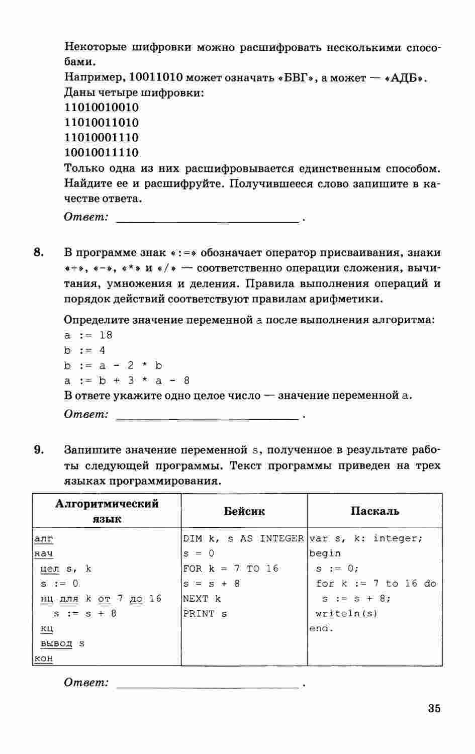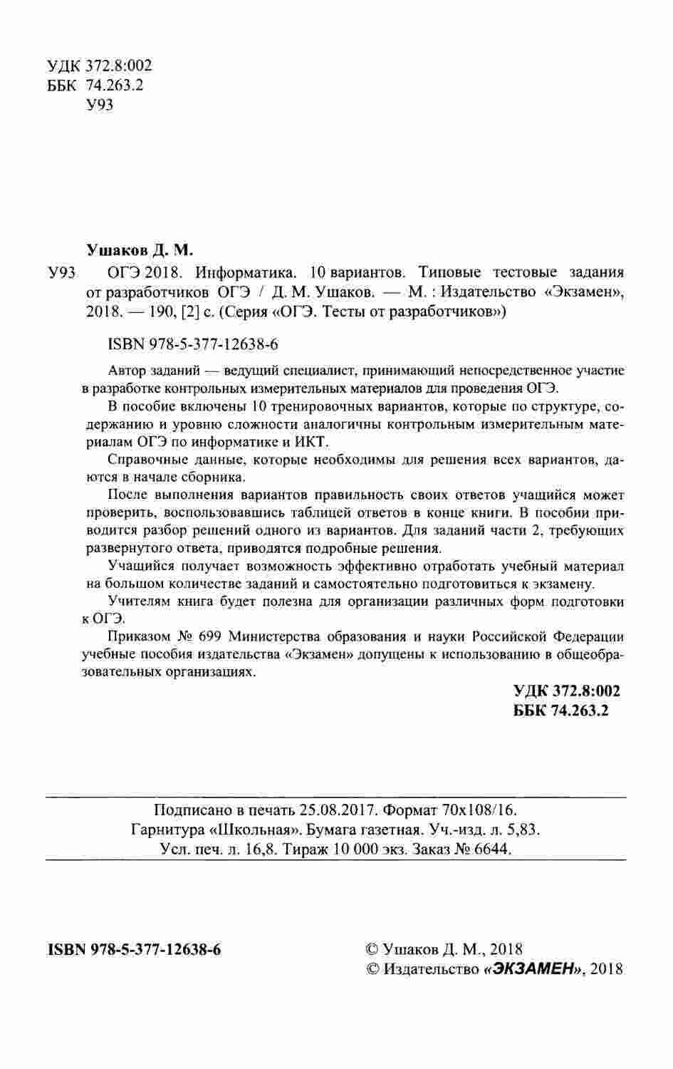 "ОГЭ 2018: Информатика. Типовые тестовые задания. 10 вариантов" от автора Юрия Ушакова - это незаменимый ресурс для подготовки к ОГЭ по информатике. Книга предоставляет 10 типовых вариантов тестовых заданий, которые полностью соответствуют формату ОГЭ. Каждый вариант включает в себя разнообразные тестовые задания, которые покрывают все ключевые темы школьной программы по информатике. Автор предоставляет подробные ответы и объяснения к каждому заданию, что помогает ученикам усвоить материал и подготовиться к экзамену. "ОГЭ 2018: Информатика. Типовые тестовые задания. 10 вариантов" предоставляет ученикам возможность проверить свои знания и навыки перед экзаменом, что делает его надежным инструментом для успешной подготовки.