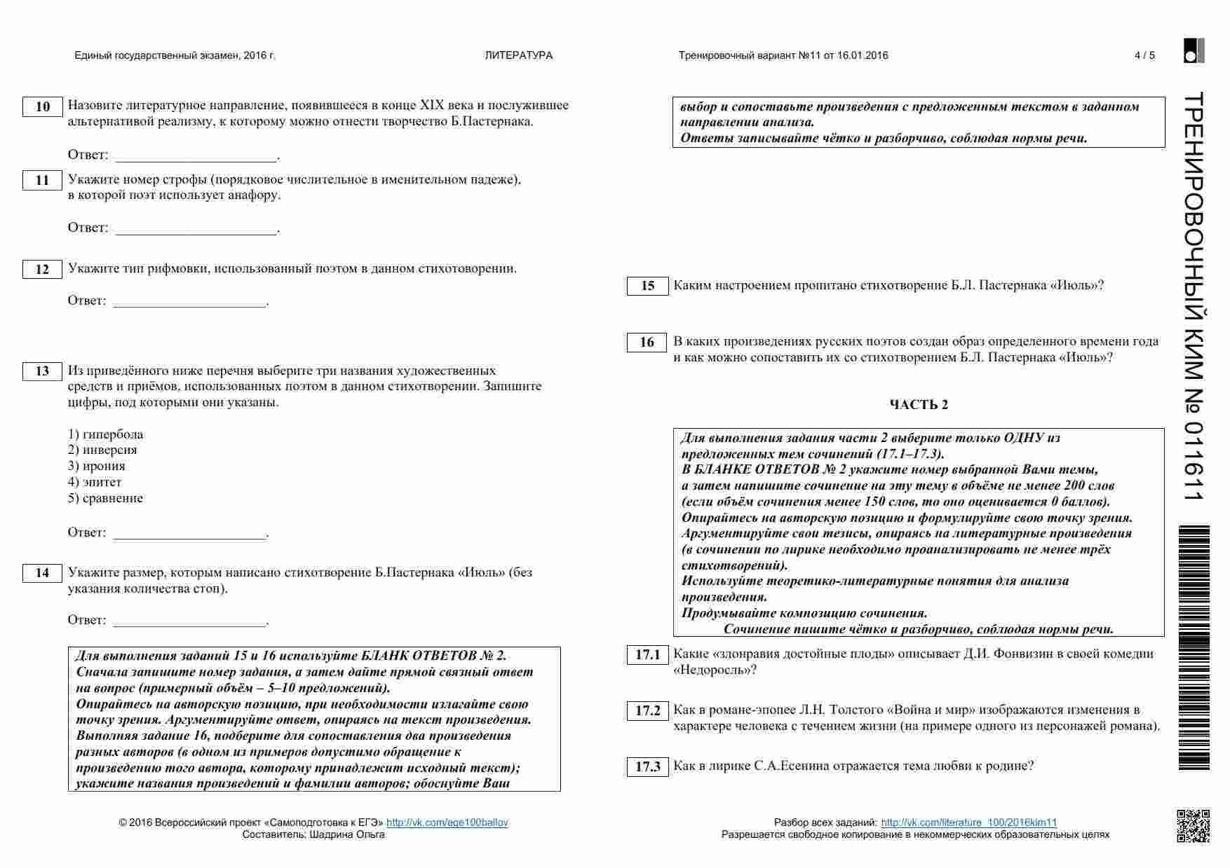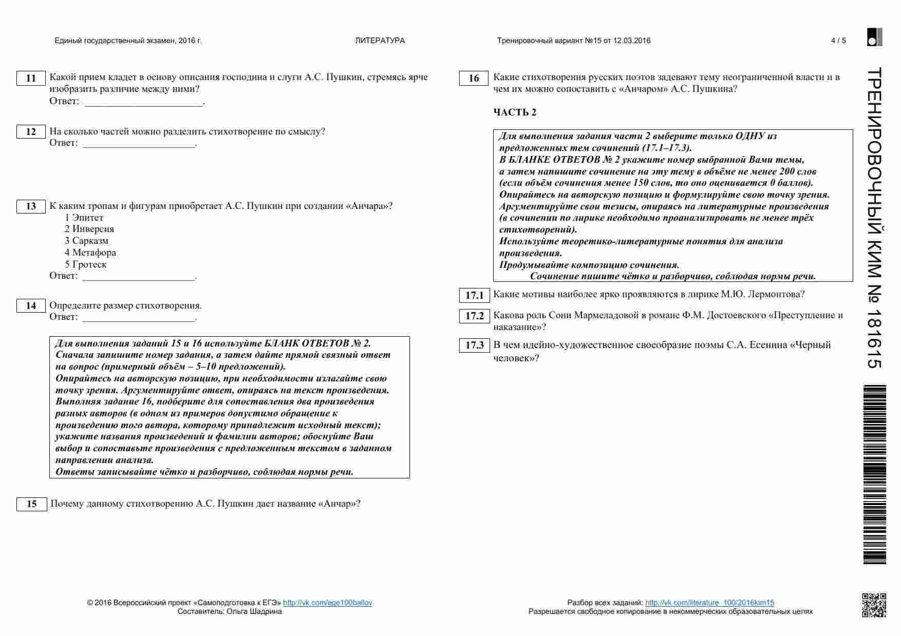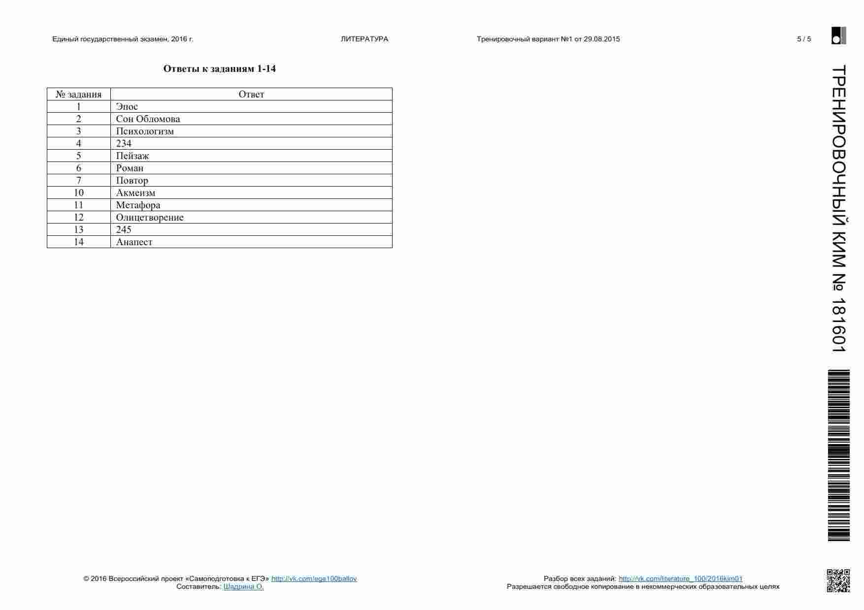 Книга "ЕГЭ 2016 Литература 11 класс. Тренировочные варианты 1-11, 13-19 с ответами. 08.2015-05.2016" представляет собой сборник тренировочных вариантов, разработанных для подготовки к ЕГЭ по литературе. Этот сборник охватывает широкий период времени и предоставляет вам множество возможностей для тренировки. Книга включает в себя разнообразные задания, аналогичные тем, которые вы встретите на настоящем экзамене. Она предоставляет вам широкий спектр материалов для тренировки анализа текстов, определения литературных приемов и аргументации ваших ответов. Каждый вариант снабжен подробными ответами и объяснениями. Эта книга подходит как для самостоятельной подготовки, так и для работы с учителем или репетитором. Она поможет вам развивать разные навыки, вырабатывать стратегию подхода к экзамену и повысить свой уровень уверенности перед ЕГЭ.