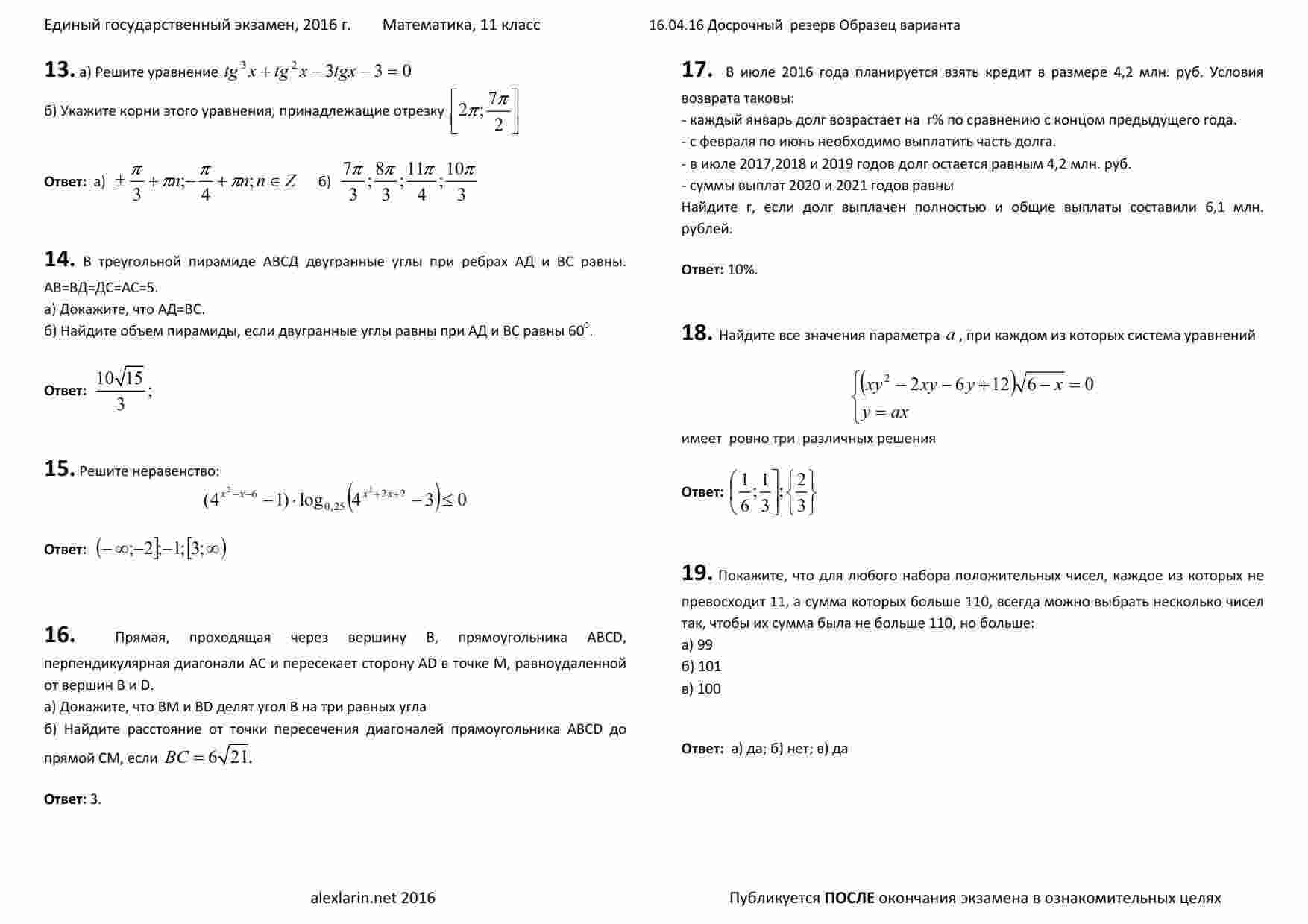 "ЕГЭ 2016 Математика 11 класс Образец заданий 19 резервного дня досрочного ЕГЭ 16.04.2016 год с ответами" - это незаменимый ресурс для студентов, готовящихся к ЕГЭ по математике. Эта книга предлагает вам образцовые задания, созданные на основе заданий, которые могли бы встретиться в резервном дне досрочного экзамена. Книга включает в себя 19 разнообразных заданий, которые охватывают всю программу по математике для 11 класса. Задачи различной сложности позволят вам проверить свои знания и навыки в решении математических задач. Особенностью этой книги является наличие подробных ответов с пошаговыми объяснениями к каждой задаче. Это поможет вам лучше понять принципы решения задач и повысить свою математическую грамотность. Кроме того, в этой книге вы найдете ответы ко всем заданиям, что позволит вам проверить свои решения и оценить свой прогресс в подготовке к ЕГЭ. С этой книгой вы будете готовы к сдаче ЕГЭ по математике на высоком уровне и сможете с уверенностью справиться с экзаменом.