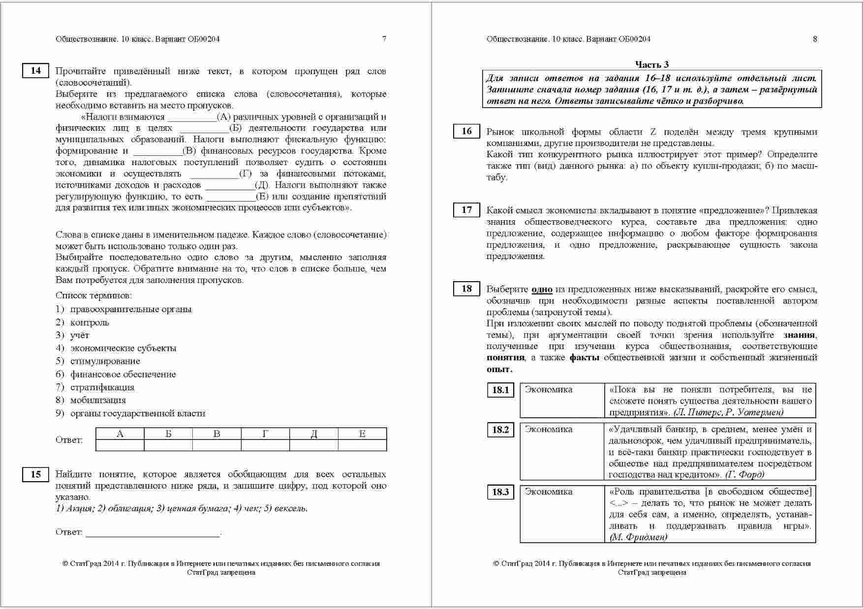 "ЕГЭ 2014 Обществознание 10 класс. Тематическая диагностическая работа" представляет собой важный ресурс для учеников, готовящихся к сдаче ЕГЭ по обществознанию. Эта книга включает в себя два варианта (203-204) тематических диагностических работ, разработанных специально для десятого класса. Каждый вариант содержит разнообразные задания, охватывающие разные аспекты предмета, что помогает ученикам углубить свои знания и подготовиться к экзамену. Дата проведения диагностической работы - 25.02.2014 года, что делает этот ресурс актуальным для подготовки. Книга также предоставляет подробные ответы и комментарии к заданиям, что помогает учащимся лучше понимать материал и повышать свой уровень подготовки.