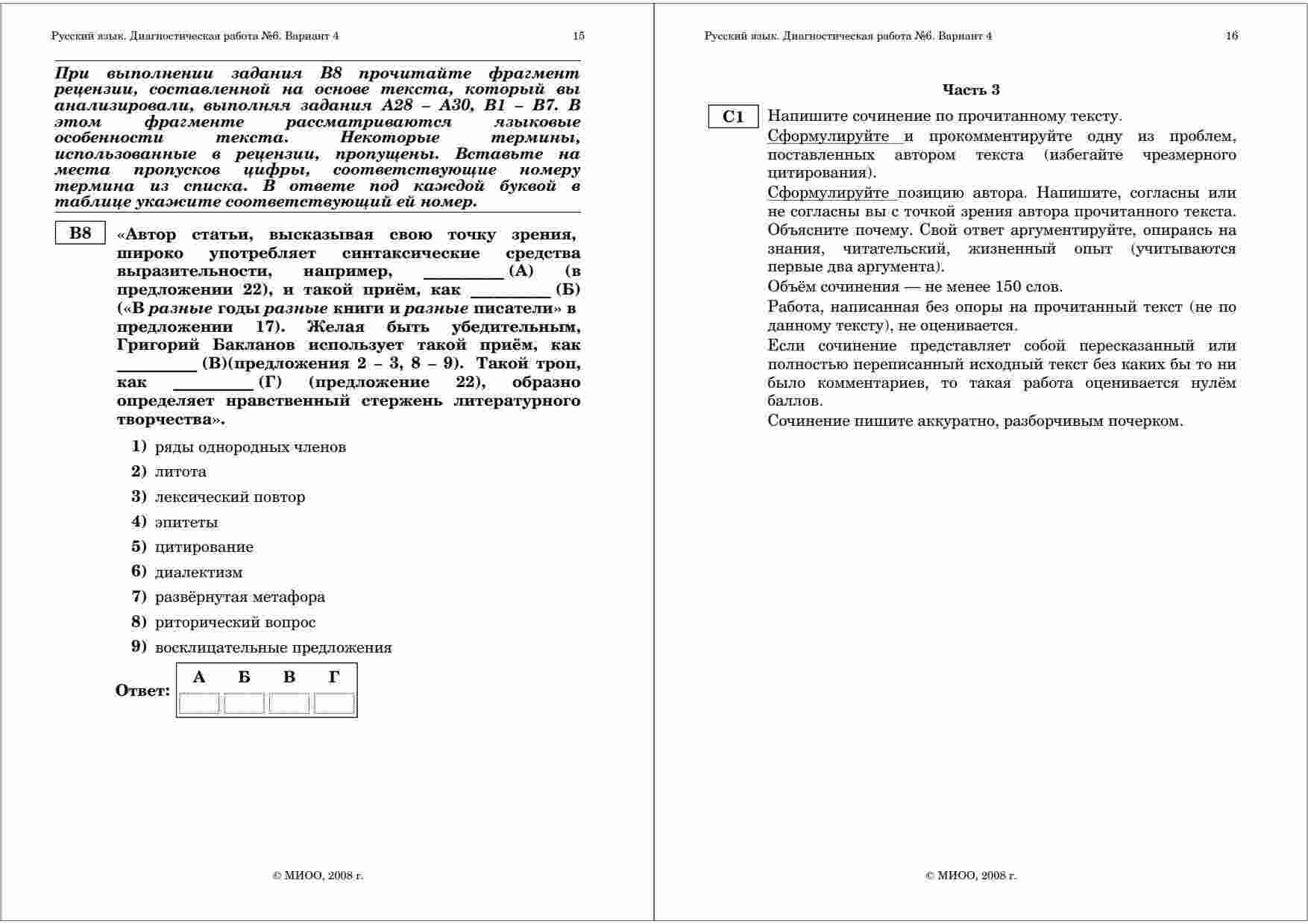 "ЕГЭ 2009 Русский язык 11 класс диагностические работы 2 варианты 1-4 9 11.12.2008 год с критериями оценивания" - это незаменимый ресурс для подготовки к ЕГЭ по русскому языку. Книга представляет собой сборник диагностических работ, включающих в себя несколько вариантов экзамена и критерии оценивания. Каждый вариант содержит задания разной сложности, позволяющие вам развивать свои навыки по грамматике, лексике и анализу текстов. Кроме того, книга предоставляет критерии оценивания, которые помогут вам понять, как экзаменаторы оценивают ваши ответы. Это издание также включает в себя ответы на задания, что позволяет вам проверить свои результаты и изучить ошибки. С помощью этой книги вы сможете максимально подготовиться к ЕГЭ и достичь высоких баллов.