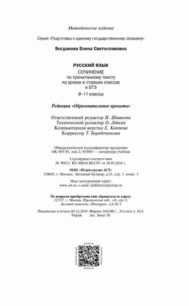"Русский язык Сочинение по прочитанному тексту" от автора Богдановой предназначена как для старших классов, так и для подготовки к ЕГЭ. Книга поможет вам развить навыки анализа и аргументации на основе текстов. Вы найдете разнообразные тексты и темы для написания сочинений. Книга предоставляет примеры сочинений на каждую тему, что поможет вам разобраться в структуре и стиле написания. С этой книгой вы сможете подготовиться к сочинительной части ЕГЭ и стать более уверенным в написании текстов на основе прочитанных материалов.